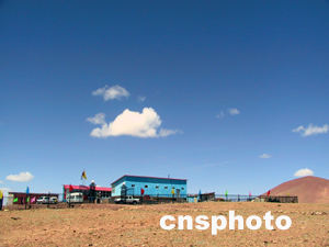 從格爾木出發(fā),沿青藏公路驅(qū)車在三百二十公里,在青藏公路和鐵路線之間的山崗上,藍(lán)天白云下一幢紅頂藍(lán)墻的塑鋼建筑格外醒目。它就是青藏鐵路北麓河試驗(yàn)段的大本營——中科院凍土工程國家重點(diǎn)實(shí)驗(yàn)室青藏高原研究基地。