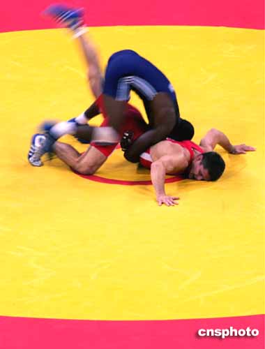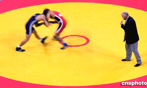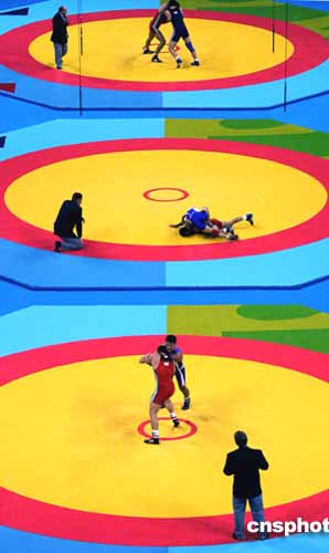 圖為當(dāng)?shù)貢r(shí)間8月25日進(jìn)行的男子六十公斤以下級(jí)摔交比賽現(xiàn)場(chǎng)。