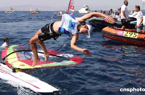 在當(dāng)?shù)貢r(shí)間8月25日進(jìn)行的女子帆船帆板米斯特拉級(jí)比賽中,法國(guó)選手馬萊特奪取金牌。