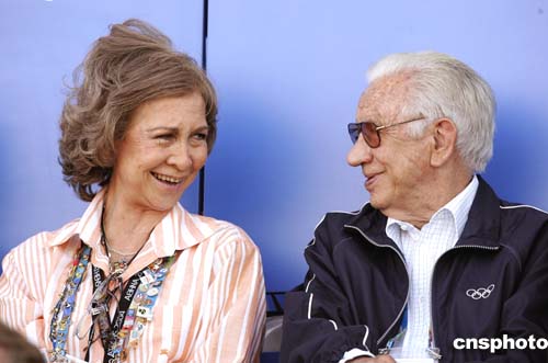 圖為西班牙王后索非亞與薩馬蘭奇在賽場邊親切交談的場面。