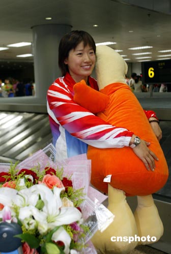 8月26日,北京首都國(guó)際機(jī)場(chǎng)又迎來(lái)一批載譽(yù)歸來(lái)的奧運(yùn)健兒,包括羽毛球、乒乓球、游泳、體操、舉重等200多名選手,他們受到英雄般的歡迎。幾乎每個(gè)人都被鮮花包圍。圖為在雅典奧運(yùn)會(huì)游泳女子100米蛙泳決賽中奪得金牌的羅雪娟被鮮花簇?fù)碇叱鰴C(jī)場(chǎng)。中新社記者:盛佳鵬
