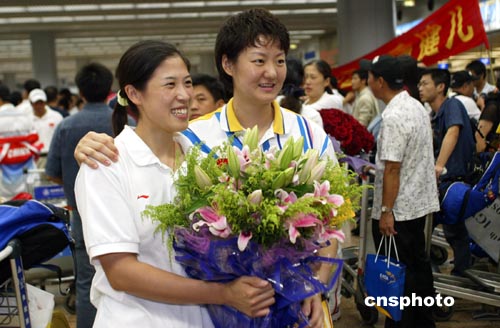8月26日,北京首都國際機場又迎來一批載譽歸來的奧運健兒,包括羽毛球、乒乓球、游泳、體操、舉重等200多名選手,他們在機場受到英雄般的歡迎,幾乎每個人都被鮮花包圍。中新社記者:盛佳鵬