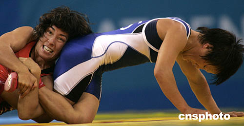 圖為在美國選手Patricia Miranda和俄羅斯選手battles Lorisa Oorzhak在女子48公斤級摔交比賽中的鏡頭。