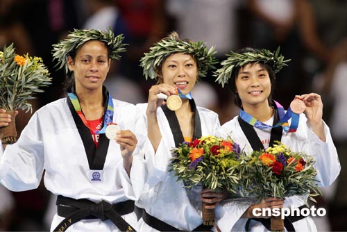 當(dāng)?shù)貢r(shí)間八月二十六日晚,在雅典奧運(yùn)會(huì)女子四十八公斤級(jí)跆拳道決賽中,中國(guó)臺(tái)北選手陳詩欣獲得金牌。這是中國(guó)臺(tái)北代表團(tuán)在奧運(yùn)歷史上的首枚金牌。中新社記者:毛建軍