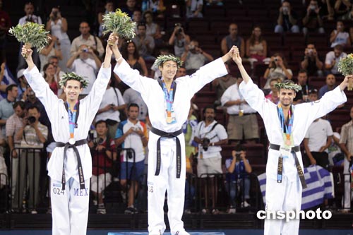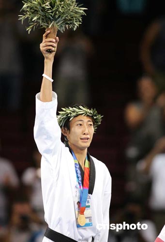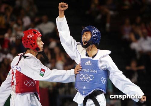 當?shù)貢r間八月二十六日晚,在雅典奧運會男子五十八公斤級跆拳道決賽中,中國臺北選手朱木炎戰(zhàn)勝墨西哥選手SALAZAR獲得金牌。中新社記者:毛建軍