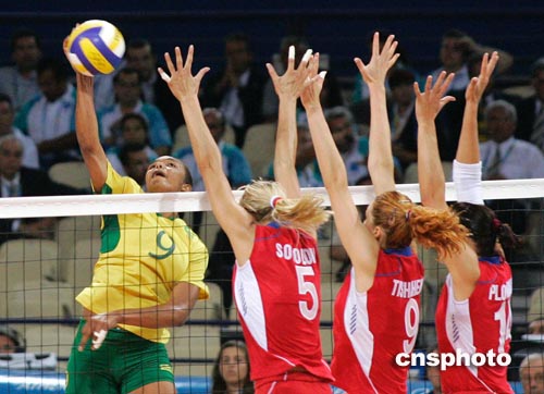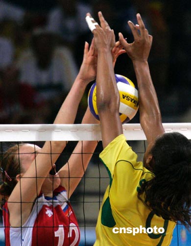 北京時(shí)間8月27日凌晨,俄羅斯女排(紅衫)在雅典奧運(yùn)會(huì)女排半決賽中,在先失兩局的情況下反敗為勝,以3比2淘汰強(qiáng)勁對(duì)手巴西隊(duì)進(jìn)入決賽。中新社記者:張煒