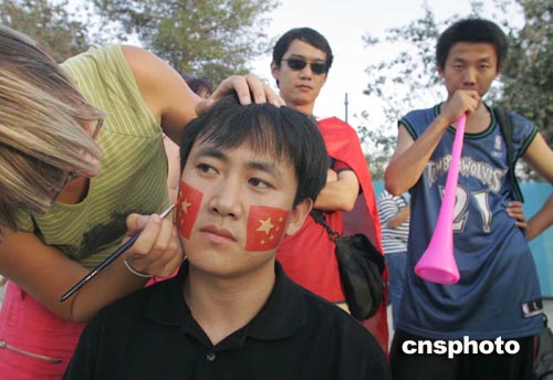 當?shù)貢r間八月二十六日,一名來自北京的球迷正在雅典排球比賽館附近請人在臉上手繪五星紅旗。雅典奧運會各項賽事接近尾聲,大批來自中國國內的奧運助威團仍活躍在各比賽場館。中新社記者:張煒