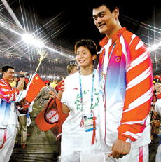 閉幕式上,為中國隊打旗的人變成了奪得110米欄金牌的劉翔,他與希臘旗手雙雙走在最前列。姚明葉莉兩人則“藏身”在后邊的大部隊中,姚明身穿中國代表團的紅色外套,葉莉一身白色T恤,身后寫著“相聚北京2008”的字樣。兩人剛進場時,姚明甚至親昵地將手搭在女友的肩膀上。身高1.90米的葉莉在身高2.26米的姚明映襯下,顯得嬌小可人。