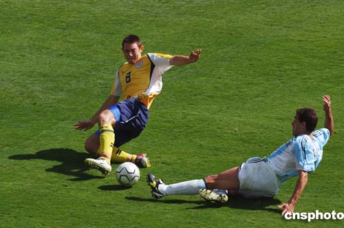 在當(dāng)?shù)貢r間28日進行的奧運會男子足球決賽中,阿根廷隊以1-0擊敗巴拉圭,獲得冠軍。圖為Cristian Gonzalez與Edgar Barreto激烈拼搶的鏡頭。