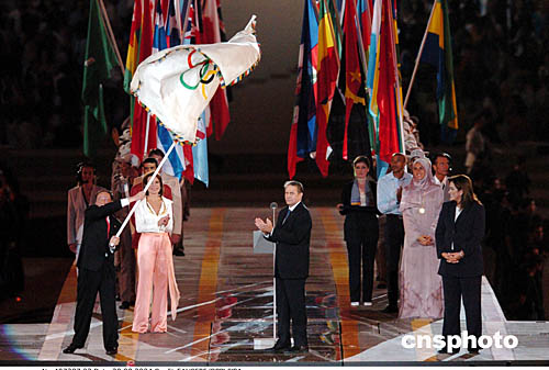 圖為北京市長王岐山從奧委會主席羅格手中接過奧運會旗,歡迎大家2008年到北京來。