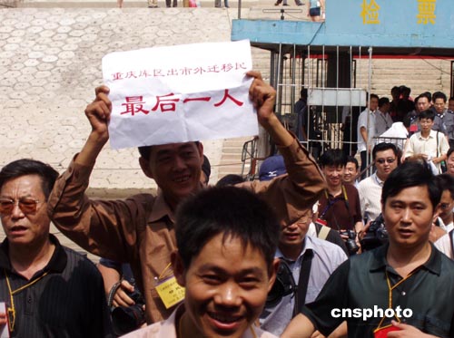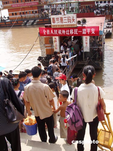| 八月二十六日,重慶奉節(jié)縣的最后一批八百八十二名外遷移民踏上外遷之路,他們將遷往江西省浮梁縣。這標(biāo)志著歷時(shí)五年由政府組織三峽外遷出省移民安置工作宣告全面結(jié)束。自一九九九年起,三峽庫(kù)區(qū)共有十六點(diǎn)五萬(wàn)人有組織地遷往沿海沿江的十一個(gè)省市。作者:周會(huì)