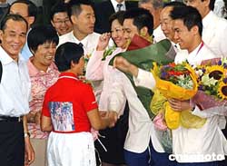 代表團(tuán)今天中午返抵機(jī)場(chǎng),雅典奧運(yùn)贏得乒乓球男雙銀牌的高禮澤及李靜亦隨隊(duì)抵港,三百多名熱愛(ài)乒乓球的小朋友,獲安排到機(jī)場(chǎng)迎接,高禮澤及李靜的父母,以及民政事務(wù)局長(zhǎng)何志平、康文署長(zhǎng)王倩儀等官員,亦到機(jī)場(chǎng)迎接。