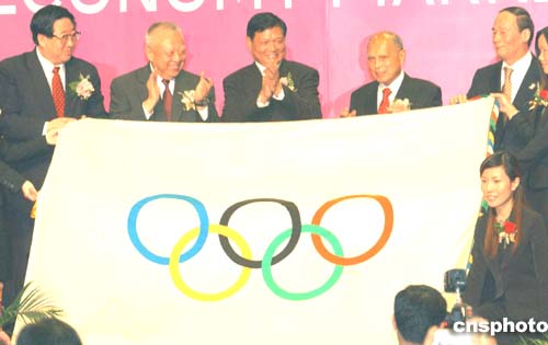 第八屆北京香港經(jīng)濟(jì)合作研討洽談會(huì)暨奧運(yùn)經(jīng)濟(jì)市場(chǎng)推介會(huì)9月2日在香港會(huì)展中心開(kāi)幕﹐北京市市委書(shū)記劉淇與市長(zhǎng)王歧山﹑全國(guó)政協(xié)副主席霍英東﹑香港特首董建華﹑香港中聯(lián)辦主任高祀仁共同打開(kāi)2008年在北京舉辦的第29屆奧林匹克運(yùn)動(dòng)會(huì)會(huì)旗。作者:趙振清