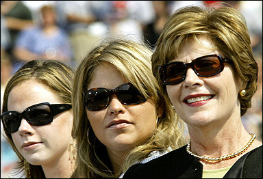 中新網(wǎng)9月5日電 據(jù)法新社報道,美國總統(tǒng)布什的家人,他的兩個雙胞胎女兒芭芭拉(左)、簡娜(中)以及妻子勞拉在布什在賓夕法尼亞州一個老兵紀(jì)念館里面對觀眾演講時在一旁為他助威。(固山)
