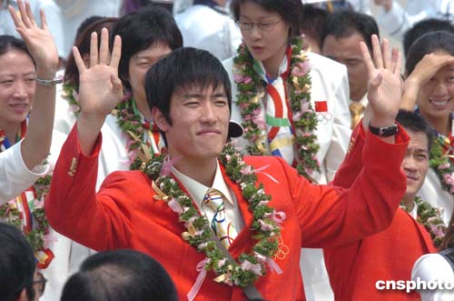 特區(qū)政府今天在香港國際機(jī)場舉行了盛大的歡迎儀式,行政長官董建華、中聯(lián)辦主任高祀仁、民政事務(wù)局局長何志平、港協(xié)暨奧委會(huì)會(huì)長霍震霆等出席了歡迎儀式。
