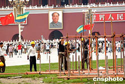 北京市政工人九月五日開始在天安門廣場搭建腳手架,準備建立組裝國慶節(jié)的大型花壇,迎接中華人民共和國成立55周年。中新社記者:鄒憲