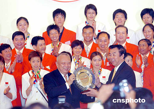 國家體育總局局長袁偉民,9月6日在香港禮賓府舉行的盛大歡迎酒會上,向董建華贈送有全體金牌選手簽名的禮物。