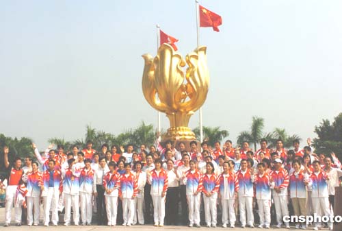 國(guó)家?jiàn)W運(yùn)金牌代表團(tuán)9月7日在香港展開(kāi)觀光之旅,9時(shí)45分抵達(dá)灣仔金紫荊廣場(chǎng)參觀,吸引大批市民圍觀,運(yùn)動(dòng)員在金紫荊像前大合照。作者:趙振清
