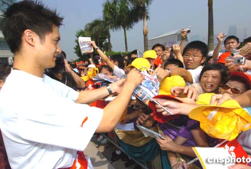 國家奧運(yùn)金牌代表團(tuán)9月7日在香港展開觀光之旅,9時(shí)45分抵達(dá)灣仔金紫荊廣場參觀,吸引大批市民圍觀,圖為田亮為熱情的香港市民簽名。作者:趙振清