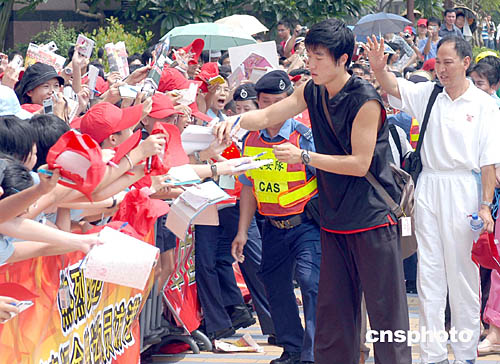 國家奧運金牌代表團9月7日在香港展開觀光之旅,金牌選手分別在香港多處名勝景點參觀,所到之處均深受廣大市民熱烈歡迎,在雅典奧運勇奪田徑110米欄金牌的劉翔在尖沙咀星光大道參觀,并為小學(xué)生簽名留念。作者:鄧慶樂
