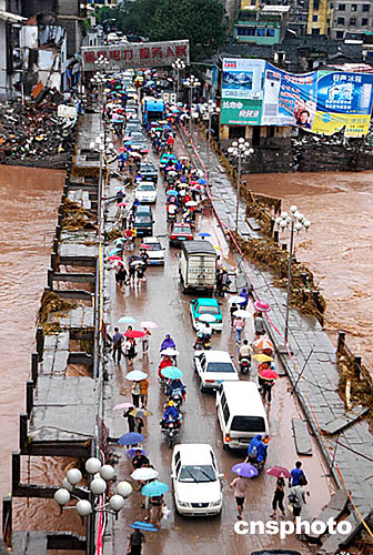 | 重慶開縣由于連日強(qiáng)降水,遭遇了二百年一遇的特大洪災(zāi),造成該縣境內(nèi)五十五個(gè)場(chǎng)鎮(zhèn)全部受災(zāi),受災(zāi)人口達(dá)八十多萬人,已有十六人在洪災(zāi)中喪生,二十六人失蹤,一百六十八人受傷。目前開縣舊城洪水已退去,被轉(zhuǎn)移的災(zāi)民陸續(xù)返回家中。舊城主要交通要道南河大橋此前被洪水淹沒,并遭部分損壞,如今已恢復(fù)通車。圖為南河大橋穿梭的人群和車輛。作者:邱垡鑫