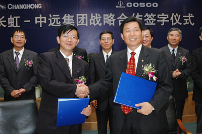 中新四川網(wǎng)9月8日消息(肖青)四川長虹集團公司董事長趙勇與中國遠洋運輸(集團)總公司總裁魏家福今日在綿陽分別代表長虹集團和中遠集團簽署了戰(zhàn)略合作協(xié)議書,雙方承諾將在國際運輸、物流、服務(wù)、信息方面展開更深更廣的合作,此舉標(biāo)志著兩公司已經(jīng)超越業(yè)務(wù)合作進入一個嶄新的階段。