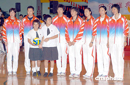 國家奧運(yùn)金牌代表團(tuán)9月8日在香港與中學(xué)生運(yùn)動交流,并舉行抽獎活動,中國女排部份隊(duì)員向獲獎學(xué)生致送簽名排球及合照。作者:鄧慶樂