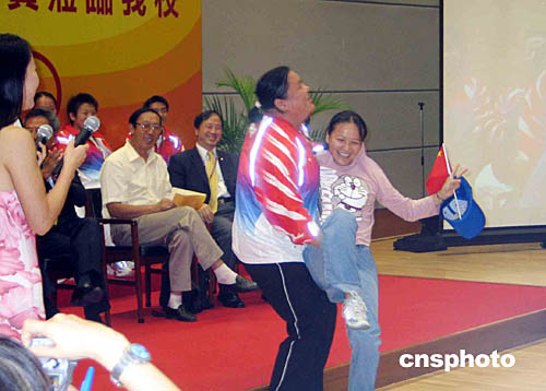 十多名中國奧運(yùn)金牌運(yùn)動(dòng)員8日到香港中文大學(xué)訪問,七百多名師生出席歡迎活動(dòng)。期間有學(xué)生要求女子75公斤舉重金牌得主唐功紅抱起她,引來全場哄動(dòng)。作者:尹丹丹