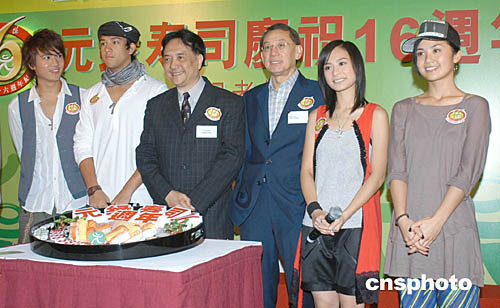| Twins、Boy'Z兩對(duì)樂(lè)壇人氣組合9月9日在香港出席元綠壽司慶祝十六周年記者會(huì),元綠壽司行政總裁梅偉筠;英皇娛樂(lè)老板楊受成與元綠壽司代言人Twins、Boy'Z一同見(jiàn)證元綠壽司生產(chǎn)八億八千八百多萬(wàn)件之創(chuàng)舉。作者:鄧慶樂(lè)