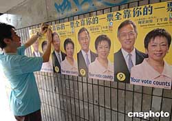 香港2004立法會選舉前夕,各地區(qū)立法會候選人進(jìn)行最后拉票活動,圖為在新界西選區(qū)候選人抓緊時間最后張貼海報宣傳造勢。作者:錢興強(qiáng)