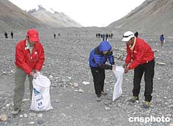 “2004地球第三極珠峰環(huán)保大行動(dòng)”的志愿者隊(duì)伍在九月十日中午十一點(diǎn)左右抵達(dá)了海拔五千一百六十米的珠峰大本營(yíng)后,環(huán)保隊(duì)開(kāi)始進(jìn)行為期三天的珠峰清掃工作。這次清掃的主要對(duì)象是登山愛(ài)好者們丟棄的生活垃圾、廢氧氣瓶、廢棄帳篷等。隊(duì)員們的行動(dòng)影響了在珠峰大本營(yíng)駐扎的各國(guó)登山愛(ài)好者,他們紛紛加入到清掃隊(duì)伍中。作者:范曉麗
