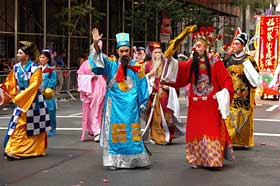 華僑華人和留學(xué)生組成了本次游行中人數(shù)最多、聲勢最浩大的隊伍,不但有舞龍、舞獅、鑼鼓,還有腰鼓、秧歌以及表現(xiàn)中國京劇藝術(shù)、少數(shù)民族服裝等傳統(tǒng)文化的表演分隊,許多路邊的觀眾也揮動中國國旗并熱烈鼓掌。