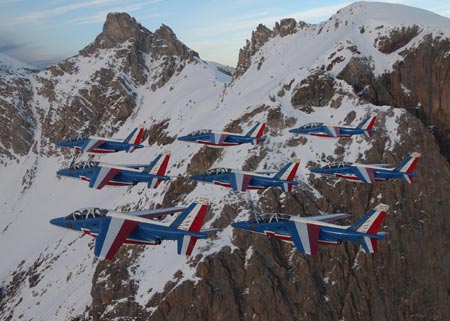 | 法國(guó)空軍的“法蘭西巡邏兵”飛行表演隊(duì)正式成立于1964年2月。飛行表演隊(duì)的飛機(jī)涂著同法國(guó)國(guó)旗一樣的紅、白、藍(lán)三種顏色,機(jī)群在空中做飛行表演時(shí)也常常把著三種顏色的煙跡留在空中。它象征著“自由”(紅色)、“民主”(白色)、“博愛”(藍(lán)色),體現(xiàn)了法國(guó)人民勇敢、浪漫的傳統(tǒng)和對(duì)未來美好的愿望。圖為8機(jī)正方形編隊(duì)(來源:艦船知識(shí)網(wǎng)絡(luò)版)