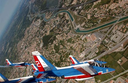 法國空軍的“法蘭西巡邏兵”飛行表演隊(duì)正式成立于1964年2月。飛行表演隊(duì)的飛機(jī)涂著同法國國旗一樣的紅、白、藍(lán)三種顏色,機(jī)群在空中做飛行表演時(shí)也常常把著三種顏色的煙跡留在空中。它象征著“自由”(紅色)、“民主”(白色)、“博愛”(藍(lán)色),體現(xiàn)了法國人民勇敢、浪漫的傳統(tǒng)和對未來美好的愿望。圖為“集合”筋斗的飛行表演項(xiàng)目(來源:艦船知識(shí)網(wǎng)絡(luò)版)