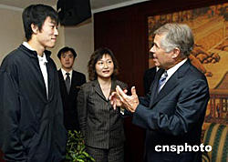 美國安利紐崔萊第二代傳人山姆.洪邦先生,九月十二日在北京與中國的雅典奧運跨欄冠軍劉翔親切交談,稱贊劉翔是一顆“黃色子彈”。中新社記者:宋吉河