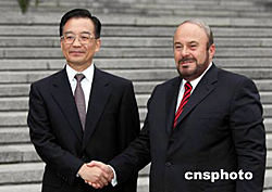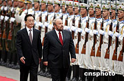中國(guó)國(guó)務(wù)院總理溫家寶九月十三日下午在北京人民大會(huì)堂東門外廣場(chǎng)主持儀式,歡迎來(lái)訪的阿爾巴尼亞總理納諾。這是中阿總理三十八年來(lái)的首次會(huì)晤。中新社記者:毛建軍