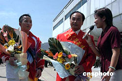 率弟子石智勇、吳美錦在第二十八屆雅典奧運(yùn)會(huì)上分別奪得男子舉重六十二公斤級(jí)金牌、五十六公斤級(jí)銀牌的著名舉重教練陳文斌(圖中),九月十三日載譽(yù)回到家鄉(xiāng)福建,成為當(dāng)?shù)孛襟w記者爭先采訪的主角。作者:劉可耕