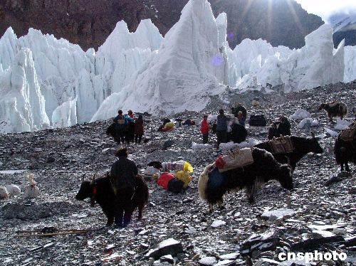 圖為在珠峰6500米處清掃的垃圾正由牦牛馱下山。作者:阿克布