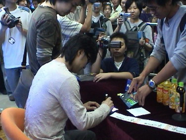 當彭坦小心翼翼的剛把腳邁出休息室走向簽售區(qū)那一刻時,還是被明眼的歌迷發(fā)現(xiàn)!疤彀。硖乖谀!”于是達達樂隊4個人基本上是飛快跑到簽售臺的,四個帥小伙的出現(xiàn)引起了現(xiàn)場不小的騷亂。人群涌動,好多小女生興奮異常。