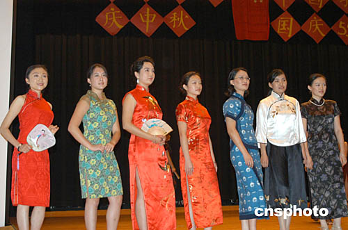 華盛頓的中國(guó)留美學(xué)生當(dāng)?shù)貢r(shí)間九月十二日晚舉行聯(lián)歡會(huì)慶祝國(guó)慶55周年,歡度中秋佳節(jié)。這是女留學(xué)生表演的具有中國(guó)民族特色的旗袍秀。作者:余東暉