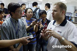 九月十四日在北京網(wǎng)球中心的新聞中心內(nèi),ATP官員Iggy(右)乘網(wǎng)球比賽因雨暫停的機(jī)會(huì)回答記者提問。