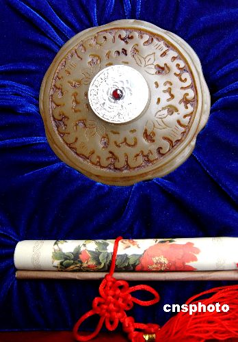2004年9月14日,鄭州,一位銷售人員在展示一款由純天然巴林玉石璧和純銀組成的月餅,月餅天然寶石。這款月餅?zāi)壳笆蹆r8000元左右。馬健 攝