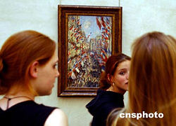 “法國印象派畫展”即將在中國開始的“法國文化年”活動中在北京展出,通過馬奈、莫奈、雷諾阿、德加和塞尚等人的五十幅國寶級作品,展示從印象派初期的探索追求,到不斷發(fā)展日臻成熟所走過的艱辛歷程。分乘五架專機運來的作品將于十月十一日開始,分別在北京、上海和香港令人大飽眼福。圖為代表作《國慶日》。中新社記者:賈國榮