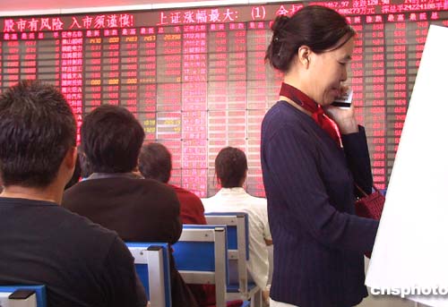 | 受利好消息的良性影響,九月二十日(周一),中國滬深股市大盤呈現(xiàn)出放量上漲的滿堂紅景觀。該日,北京股民神態(tài)自若地在證券營業(yè)部內(nèi)進行交易。當日兩市共成交約419億,比上一個交易日明顯放大。其中上證指數(shù)漲跌幅達+3.43%;上證B股指數(shù)漲跌幅達3.46%;深證成指漲跌幅達3.76%;深證成份B指漲跌幅達4.07%。中新社記者:鄒憲
