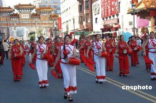 二零零四年華盛頓中國文化節(jié)九月十九日在華盛頓唐人街舉行。身著民族服飾的東方女子敲起腰鼓,別有風(fēng)韻。 作者:余東暉
