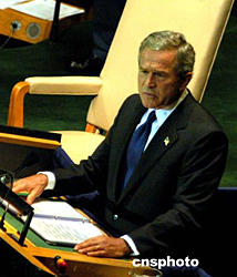 美國(guó)總統(tǒng)布什繼巴西總統(tǒng)盧拉后第二個(gè)發(fā)言,這也是聯(lián)大一般性辯論的慣例。布什繼續(xù)向國(guó)際社會(huì)宣傳伊拉克戰(zhàn)爭(zhēng)的必要性,說(shuō)伊拉克戰(zhàn)爭(zhēng)是為了世界的和平與公正,因?yàn)橐晾耸冀K沒有全面遵守安理會(huì)的有關(guān)決議,所以必須承擔(dān)嚴(yán)重后果。布什還慷慨解囊,提議在聯(lián)合國(guó)建立“民主基金”,許諾美國(guó)將首先給予資助,他認(rèn)為“民主基金”將幫助一些國(guó)家建立法律法規(guī)、獨(dú)立的法庭、自由出版物、政黨和貿(mào)易聯(lián)盟,并由此打下民主的基礎(chǔ)。