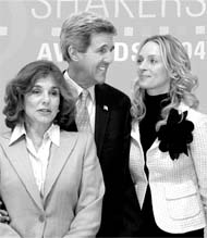 日前,她出席了紐約一個名為第七屆全年“RedbookMothersand-Shakers”大獎,接受大會頒贈的獎項。同一場合,與現(xiàn)任美國總統(tǒng)布什競逐下任美國總統(tǒng)的克里(圖中)也有出席,還與這位巨星一同合照。(鐵巖)