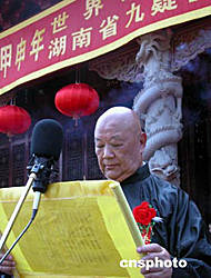當所有海內(nèi)外舜裔宗親和當?shù)厝罕娨黄鹣蛩吹坌型耆瞎Y后,來自香港的世界舜裔宗親聯(lián)誼會主席、主祭人陳守仁先生和湖南省九嶷山舜帝陵基金會理事長王克英分別盥手恭讀祭文。隨后,焚燒的祭文帛書承載著舜裔后代對先祖的無限景仰和追思之情,化作了縷縷青煙直上九霄。