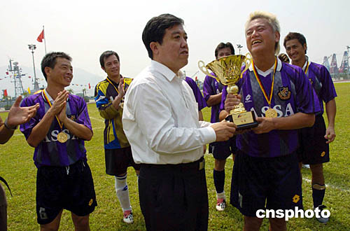 圖為外交部駐港特派員楊文昌向明星隊頒發(fā)冠軍獎杯。