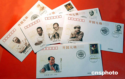 | 在慶祝中華人民共和國成立五十五周年之際,中國郵票博物館九月二十九日出品發(fā)行了一套十五枚《開國元勛》絹質(zhì)紀(jì)念封。《開國元勛》絹質(zhì)紀(jì)念封其中印有毛澤東、周恩來、劉少奇、朱德、任弼時、鄧小平、陳云、彭德懷、劉伯承、賀龍、陳毅、羅榮桓、徐向前、聶榮臻、葉劍英等開國元勛的生活圖象和貼有相應(yīng)肖像郵票。這套絹質(zhì)紀(jì)念封也被收納在中國郵票博物館于當(dāng)日發(fā)行的《開國元勛》金銀郵品典藏冊之中。中新社記者:鄒憲